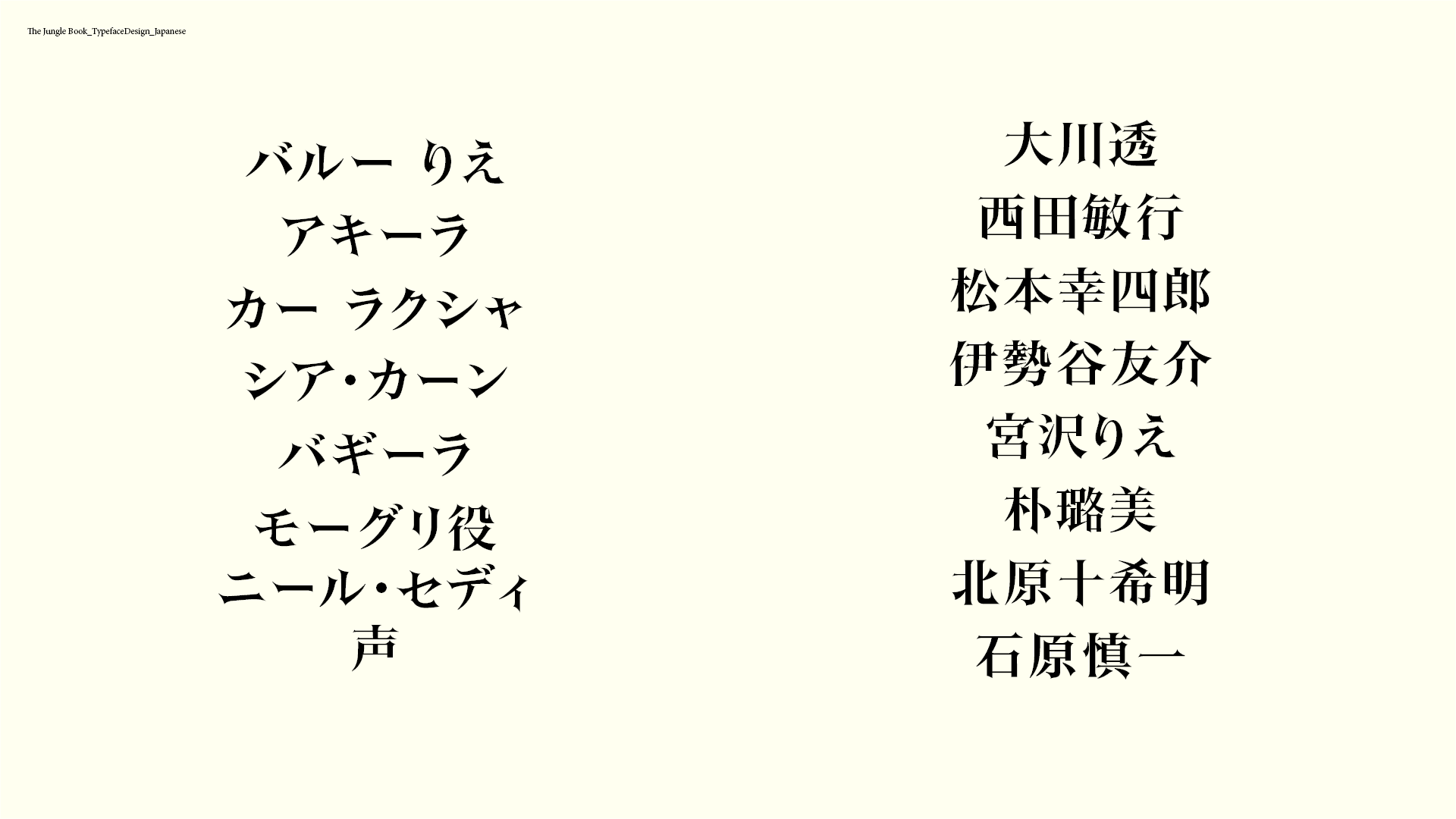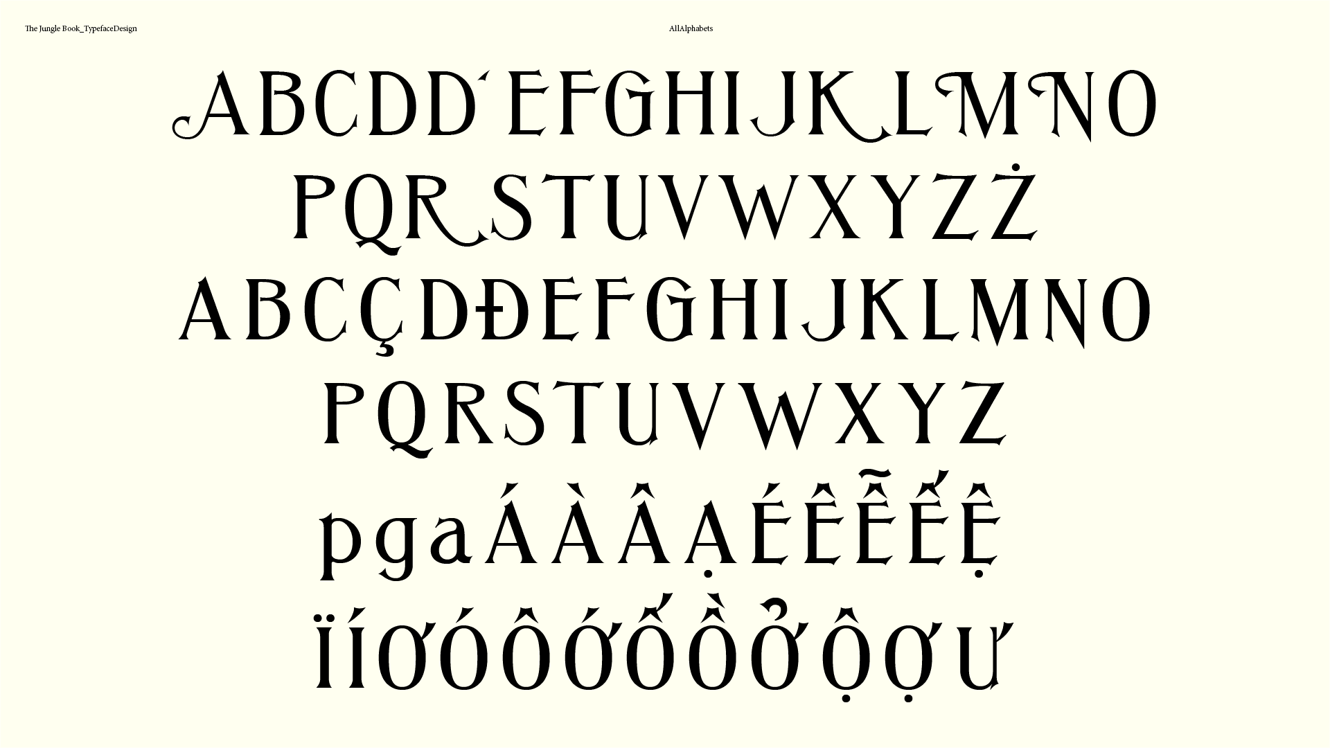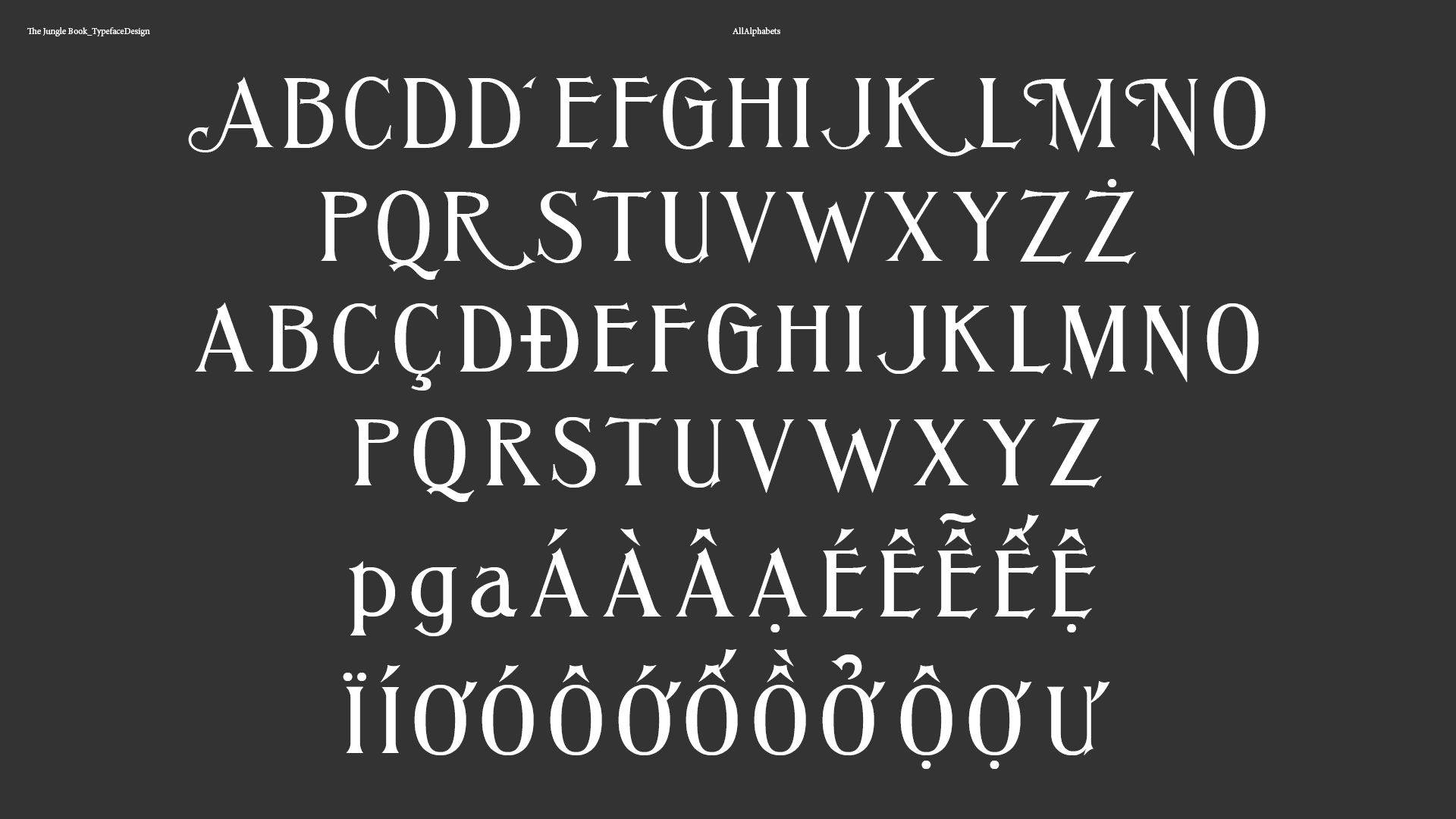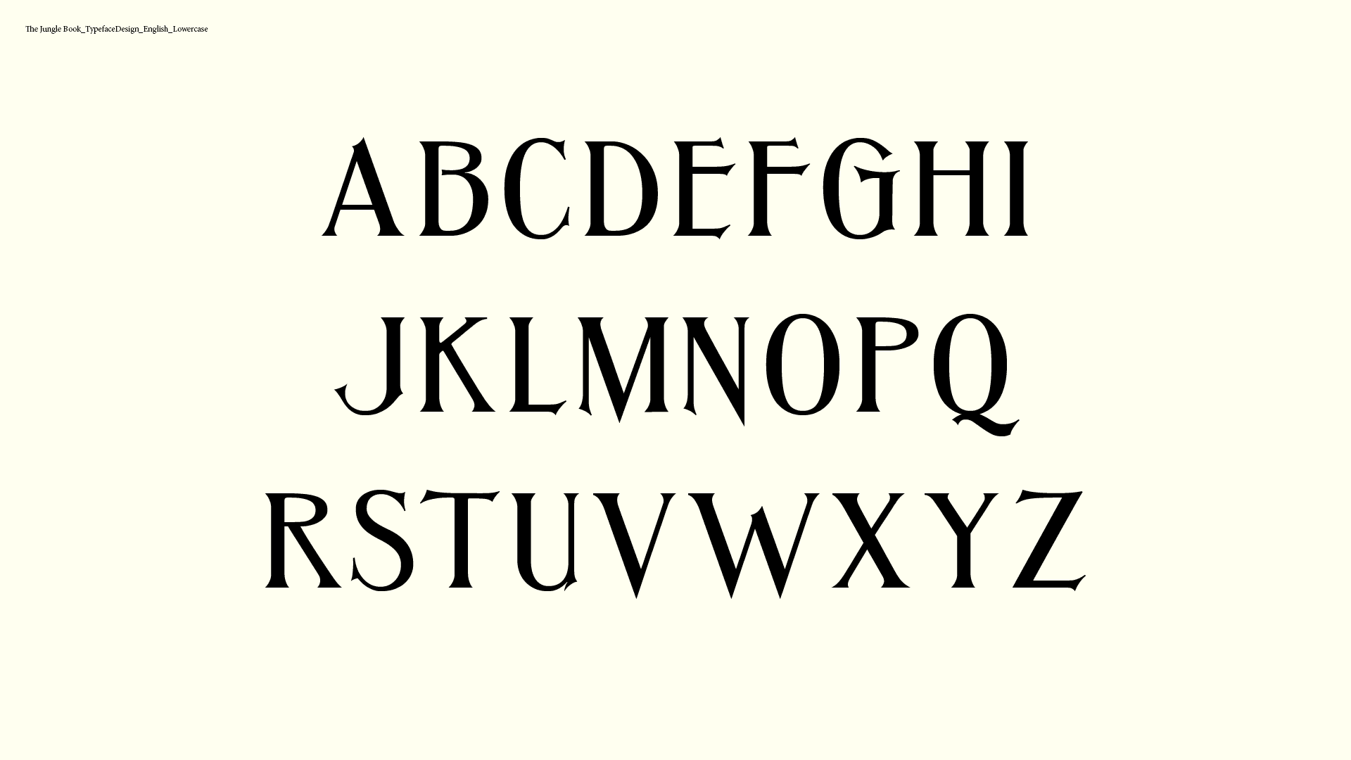 Director Jon Favreau was taking main on end title sequence as an important part of the film. We decided to custom design a set of typeface to echo the tone from the film. With that purpose, I had developed a set of typeface extracted from the old animated Jungle book in 1967, and push it to a modern level. The typefaces have been extended to different languages later on since the film was showing in different countries. Languages include English, French, Germany, India, Latin-American Spanish, Brazil, Italy, Poland, Thailand, Vietnam and Japanese.